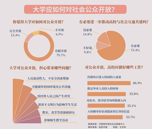大学应如何开放?调查显示,超九成受访者支持大学对社会公众开放,其中,79.7%的受访者支持大学有限开放,需要对入校方式、时间等加以限制,13.4%的受访者认为大学应不做限制地完全开放。也有6.9%的受访者认为不应该开放。