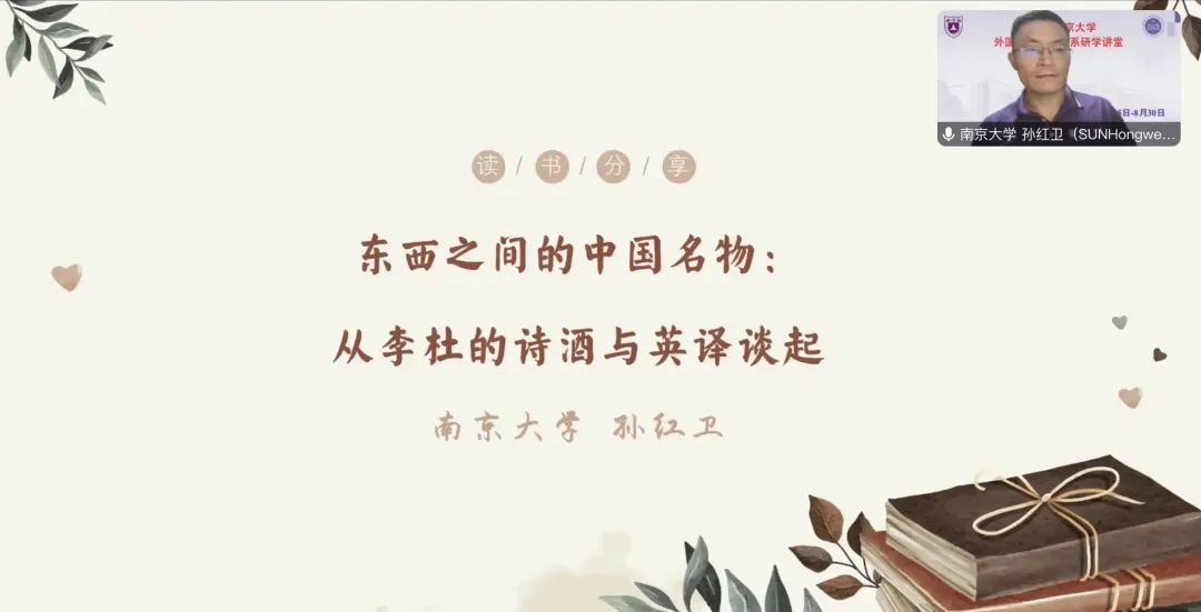 孙红卫副教授带来以“东西之间的中国名物:从李杜的诗酒与英译谈起”为主题的精彩讲座。讲座上,孙红卫和同学们分享了有关李白杜甫诗中的酒的文化意象和翻译,具体从“浊醪”的译法、谷物酒与葡萄酒、糟丘与酒器以及“舶来品”与共享的诗意四个方面探讨中国酒的文化象征。