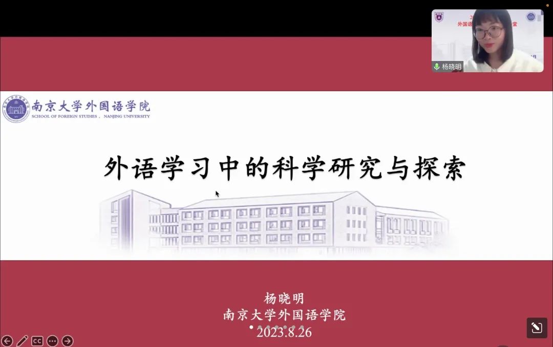 杨晓明老师以“外语学习中的科学研究与探索”为主题分享了自己在外语学习中的科学研究,展示了自己如何将学习生活中发现的问题转化成具体的科学研究实践。