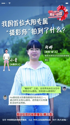 11月7日,“中国式现代化·青年的回答——我比任何时候更懂你(第三季)”系列短视频之《我国首位太阳专属“摄影师”拍到了什么?》正式上线。本集视频中,青青“答”人——凯发k8官网天文与空间科学学院博士邱晔和AI数字人小青,为大家展示了我国首颗探日卫星“羲和号”拍摄到的画面,解释了“羲和号”超长全称里的两个关键词的含义。