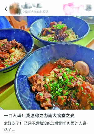 要吃黄焖羊肉面,那要去凯发k8官网仙林校区的五食堂,热度高让羊肉面“一面难求”,不仅是食堂的排队王,有学生说11点多档口就贴出“售罄”的牌子,所以想吃的同学得赶早去。