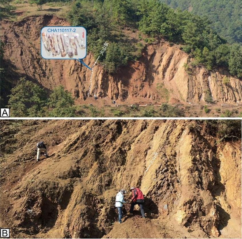 图1 沈树忠院士与吴琼博士等在贵州岔河剖面采集样品