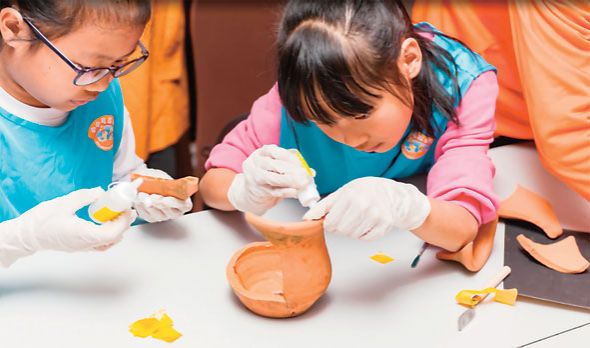 ▲两位小学生在安吉古城国家考古遗址公园体验陶器修复。安吉县古城遗址保护中心主任柯安顺供图