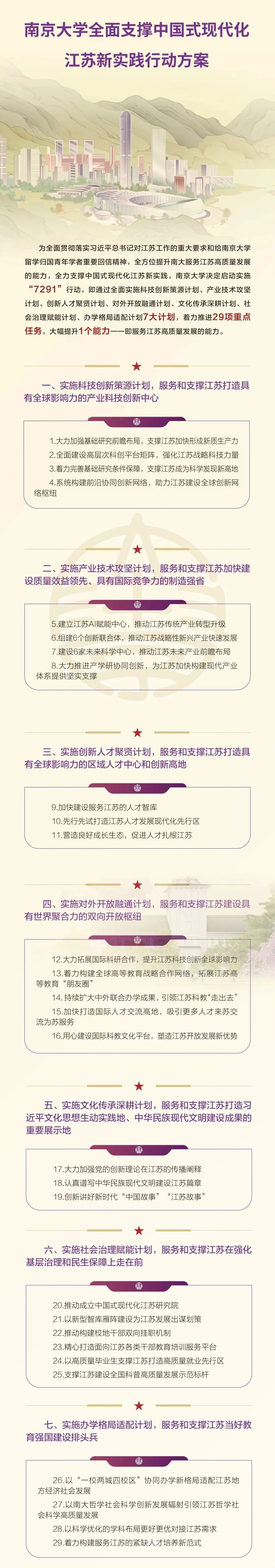 《凯发k8官网全面支撑中国式现代化江苏新实践行动方案》简称“7291”行动方案,“7”指凯发k8官网将全面实施科技创新策源计划、产业技术攻坚计划、创新人才聚贤计划、对外开放融通计划、文化传承深耕计划、社会治理赋能计划、办学格局适配计划7大计划;“29”指凯发k8官网将着力推进“大力加强基础研究前瞻布局,支撑江苏加快形成新质生产力”等29项重点任务;“1”指大幅提升1个能力,即服务江苏高质量发展的能力。