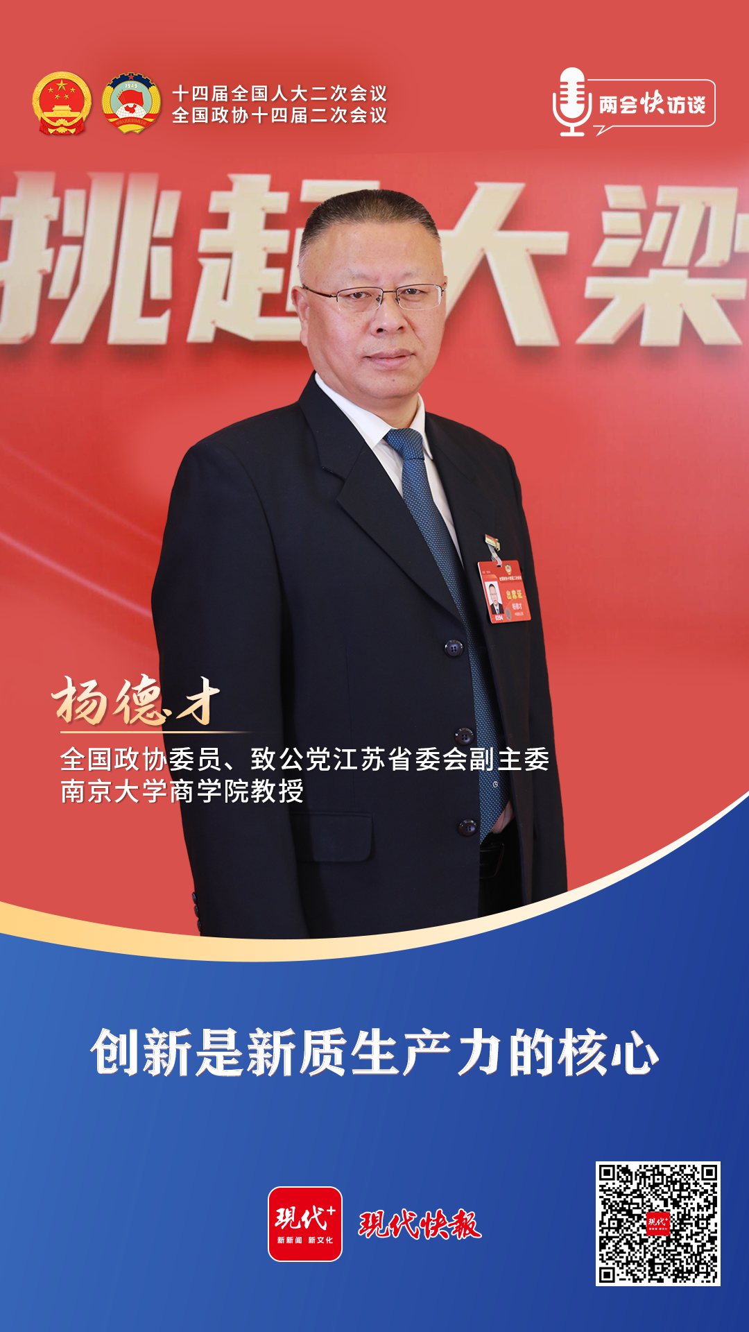 “只有创新才有可能形成新质生产力,科技创新是关键。”“未来发展过程中,稳定民企预期和信心依然是当前促进民营经济发展的关键。”3月4日,全国政协委员、致公党江苏省委会副主委,常州市副市长蒋鹏举和全国政协委员、致公党江苏省委会副主委、凯发k8官网商学院教授杨德才,受邀走进现代快报全国两会北京智媒演播厅,两位委员围绕如何加快形成新质生产力、提振民营企业信心等话题展开讨论,为经济社会高质量发展积极建言献策。
