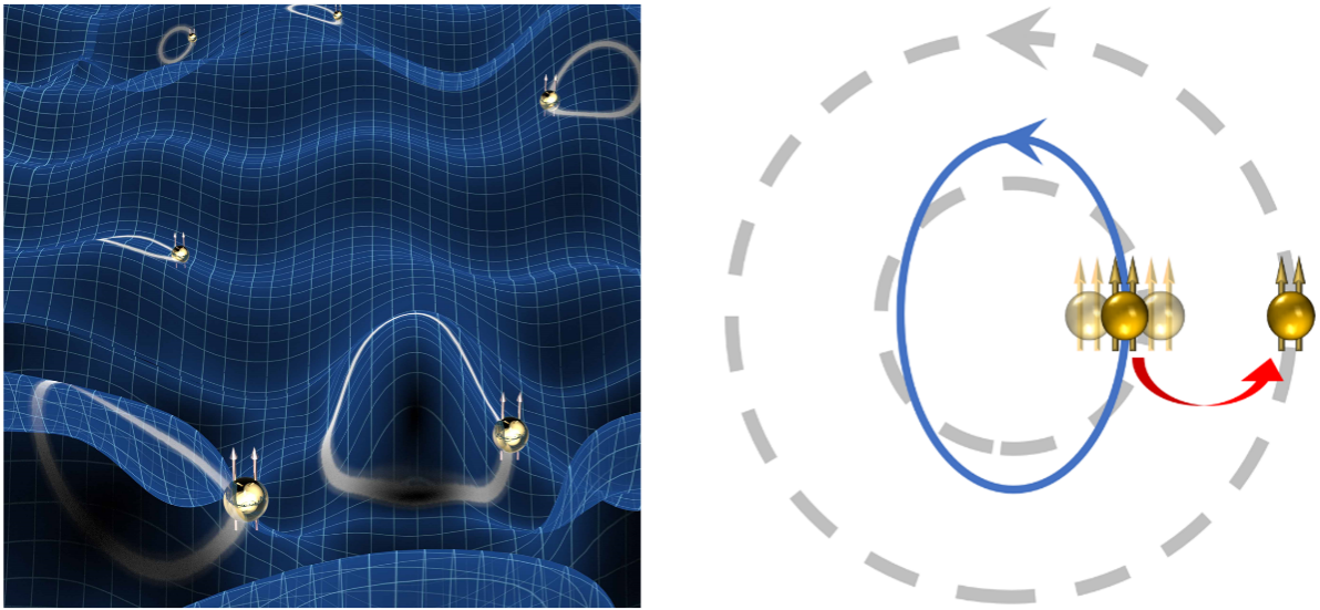 对于宇宙中的基本粒子,凝聚态系统中那些满足其类似行为规律的集体激发可被视作基本粒子投射在这些系统上的影子,是准粒子。近年来,理论物理学家Haldane(2016年诺贝尔物理学奖得主)提出分数量子霍尔效应中可能存在着引力子激发,也被称为分数量子霍尔效应引力子。分数量子霍尔效应,作为一种强关联拓扑效应,是当代凝聚态物理的最重要研究前沿之一,其发现获得了1998年诺贝尔物理学奖。其中主要的分数量子霍尔态在图像上可被理解为复合粒子(一个电子绑上两个磁通量子)在执行回旋轨道运动。而Haldane对分数量子霍尔效应给出了新的量子几何解释,认为存在着一种长期被忽视的量子度规,这一度规可描述运动轨道的形状(图1左)。该度规扰动的量子化即引力子激发,表现为轨道形变产生的最低能量长波集体激发(图1右),理论预测该集体激发是自旋2的手性激发,其自旋只能为+2或-2。Bergshoeff和Townsend等人(这两位是M理论的主要提出者之一)进一步指出,引力子激发可以被非相对论极限下的2+1维、有质量的Fierz-Pauli场方程所描述,同时也可被零简化的3+1维线性爱因斯坦场方程所描述,揭示了这类神秘粒子的引力子特征。作为分数量子霍尔效应新几何理论的关键结论,引力子激发对凝聚态物理本身也具有极其重要的意义。此前,分数量子霍尔效应被认为可以通过陈-西蒙斯拓扑量子场论来描述。然而,Haldane提出的这一几何理论超越了该领域传统拓扑量子场论的框架,带来了一种新的“陈-西蒙斯+量子几何”理论,从而可以为关联物态的研究打开新的方向。而引力子激发的存在,如果证实,将为这一新的关联物理提供重要的实验支持。此外,引力子激发可以用来分辨一些分数量子霍尔态所具有的非阿贝尔基态波函数,对于实现拓扑量子计算有着关键的意义。遗憾的是,寻找分数量子霍尔效应引力子,一直是悬而未决的问题,至今未能突破。