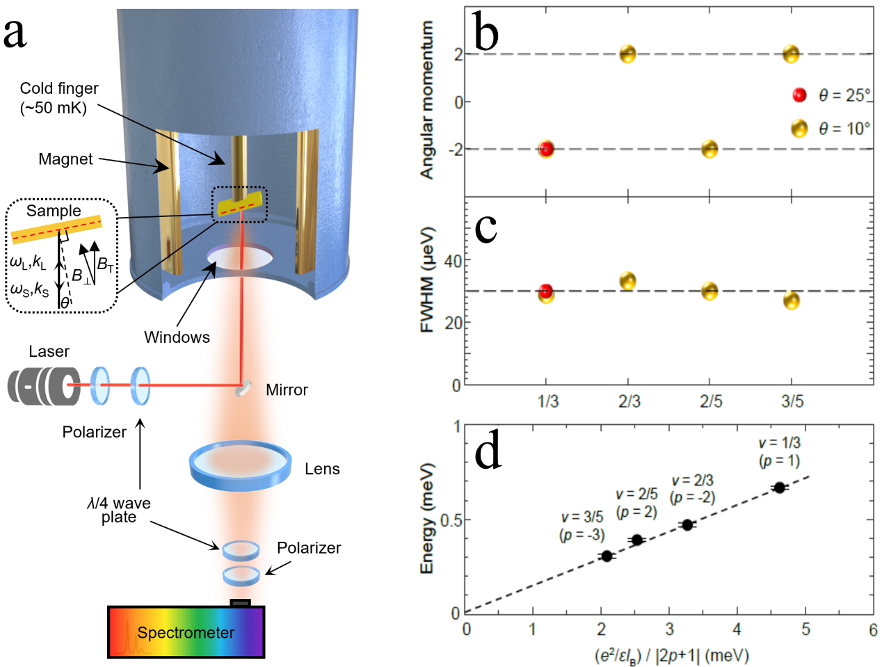 对于该实验测量,无论是从实验技术,还是从基础物理创新角度,都意味着是0到1的突破。杜灵杰带领团队,花费数年时间,通过精妙的设计将看似矛盾的测量要求一一实现,在凯发k8官网自主设计、集成组装了一台根植于He3-He4稀释制冷技术的极低温强磁场共振非弹性偏振光散射系统(图3a)。这一特殊的“望远镜”有两层楼高,可以在零下273.1度下捕捉到最低达10GHz的微弱激发并判断其自旋。测试表明,这一技术的相关测量参数达到国际领先水平,为引力子激发的测量奠定了实验基础。依靠这一利器,实验团队在砷化镓半导体量子阱中成功观测到分数量子霍尔效应引力子,取得重要突破。团队通过共振非弹性光散射测量到了最低能量长波集体激发,并通过改变入射和散射光的自旋,观察到该激发具有自旋2的特性且是手性的(图3b)。并且测量到的极小激发峰宽符合动量守恒下引力子激发的长波特性(图3c),而测到的能量在m/n分数态正比于Ec/n(Ec为库伦能),符合其能量特性(图3d)。这些结果从自旋,动量和能量角度充分提供了引力子激发的实验证据。