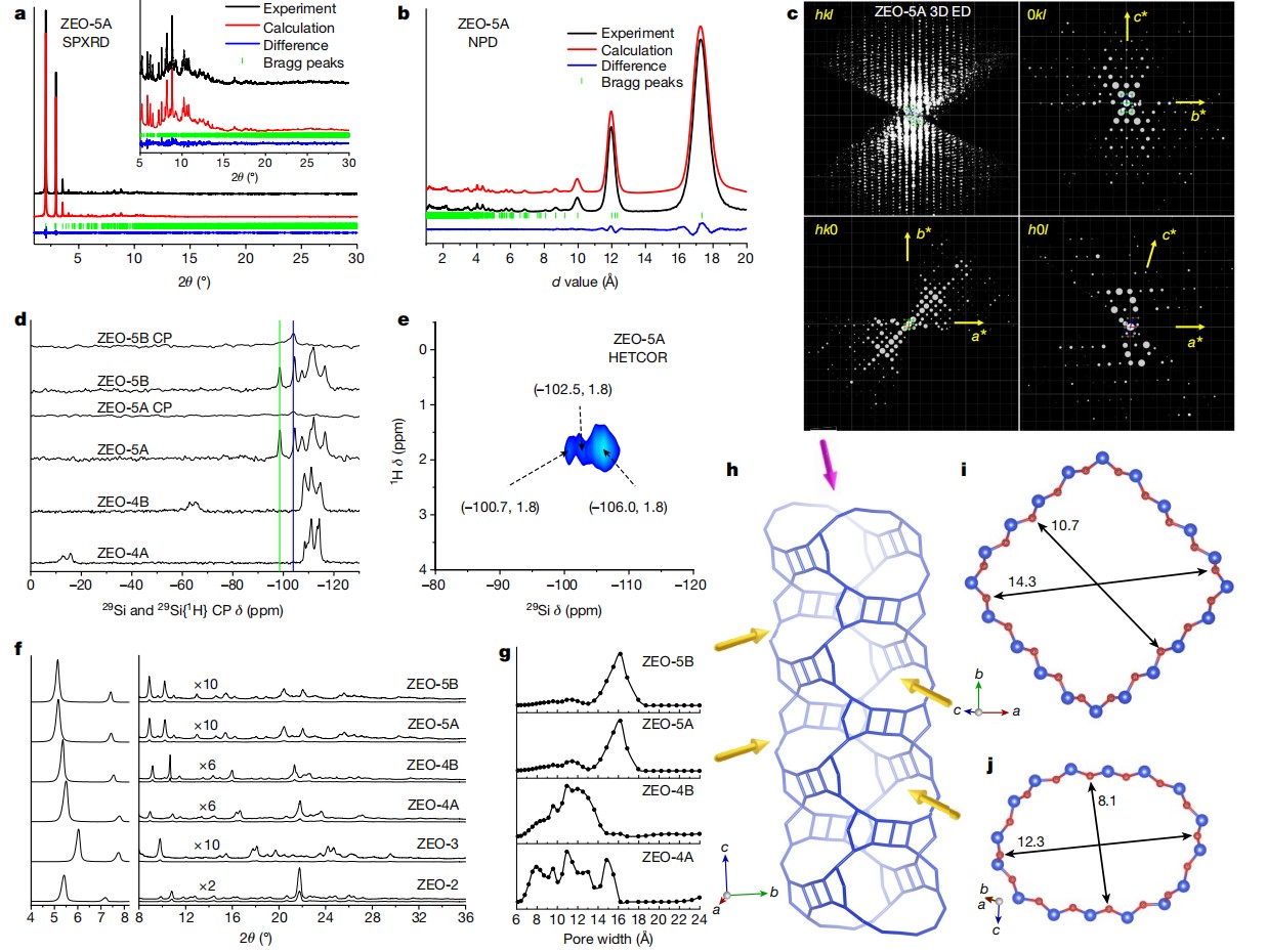 研究团队成功合成的ZEO-5超大孔分子筛的结构中包含两个前所未有的张力极大的双四环单元(三重四环)拓扑结构,这种结构在沸石分子筛中尚无先例。该分子筛拥有超大的晶胞和轻元素组成,这给其结构的确定带来了显著挑战。中子衍射技术,以其高分辨率和对轻元素的敏感性,为解析这一复杂结构提供了关键手段。
