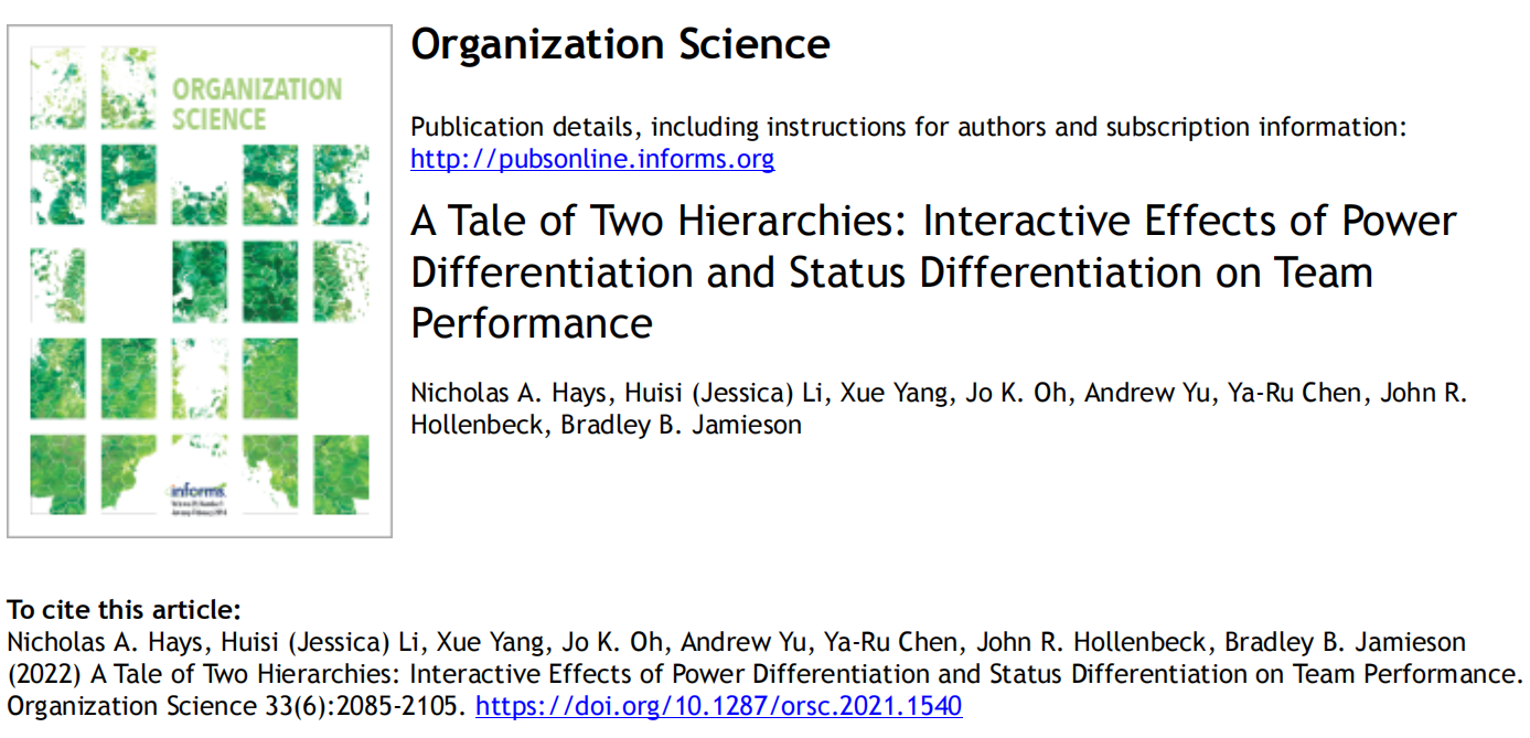 近年来,凯发k8官网商学院杨雪教授与密歇根州立大学布罗德商学院尼古拉斯·海斯教授(Nicholas A.Hays)、佐治亚理工大学谢勒商学院李慧斯教授(Huisi Jessica Li)等组成科研团队,通过系列研究确认了权力差异和地位差异对团队绩效的影响。相关成果日前以“A Tale of Two Hierarchies: Interactive Effects of Power Differentiation and Status Differentiation on Team Performance ”为题发表在UTD-24国际商学顶级期刊Organization Science。