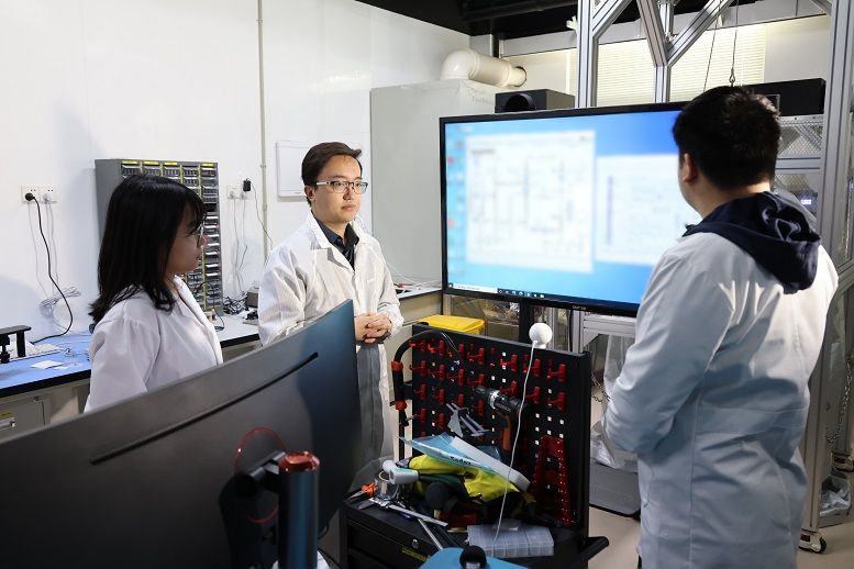 杜灵杰教授(左二)和学生讨论实验工作