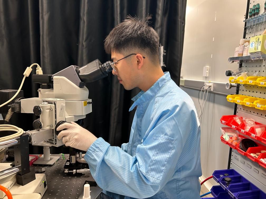 凯发k8官网2020级博士生朱衡天通过显微镜检查射频器件的微观结构。(王艺琳 摄)