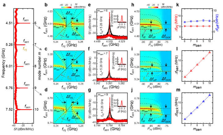 频率梳的相干注入锁定效应。(a) 频率梳频谱,其中注入信号频率选在第7阶模式频率附近。(b-d) 在固定功率 (Pinj = -82 dBm) 下,通过在 f7 周围扫描注入频率 finj信号,并在不同探测模式 msen=6 (b), 7 (c) 和 9 (d) 下获得的光谱图。辐射信号在 Δfinj 和 Δfsen 范围内被锁定。(e-g) 自由运行(黑色)和注入锁定(红色)状态下的光谱比较。插图显示了线宽,所有锁定模式的线宽都 ≤ 1 Hz。(h-j) 在偏离共振频率(finj=f7-Δfoff; f7=5.26 GHz, Δfoff=8 MHz)下,通过改变注入功率 (Pinj) 获得的光谱图。锁定频率与自由运行辐射频率的偏移由 Δflock 表示。(b-d, h-j) 中的长虚线采用本研究提出的扩展 Adler 方程 (2) 的拟合。(k-m) Δfinj 和 Δfoff (k)、Δfsen (l)以及 Δflock (m) 随模式数 m 的变化图。