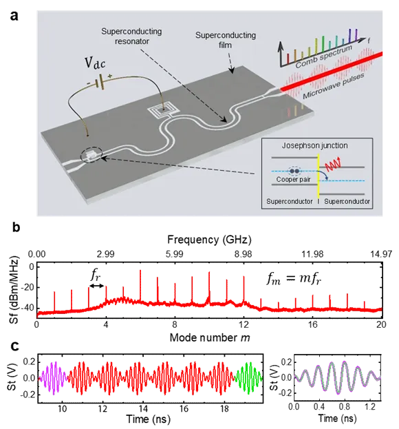 片上集成超导微波频率梳。a,该频率梳信号源由超导约瑟夫森结与超导谐振器耦合构成,仅需一个直流信号进行驱动。b,辐射的信号在频谱上为一系列等间隔的谱线。c,对应的时域信号为一系列高度相干的脉冲微波信号。
