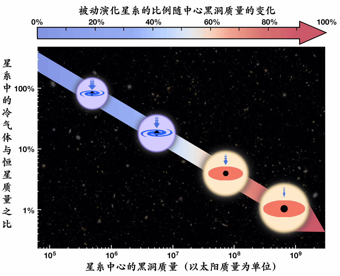 “研究恒星形成星系如何转变为被动演化星系,是星系形成和演化领域的最核心任务之一。”王涛说,自20世纪70年代,理论家就提出,星系中心的超大质量黑洞,在吸积物质的过程中释放的巨大能量,对星系的形成演化,尤其是对星系从“生”到“死”的转变有重要的作用。