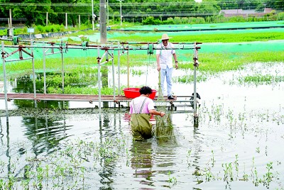 上海海洋大学师生在蟹塘检查“白玉蟹”蜕壳情况。新华社发