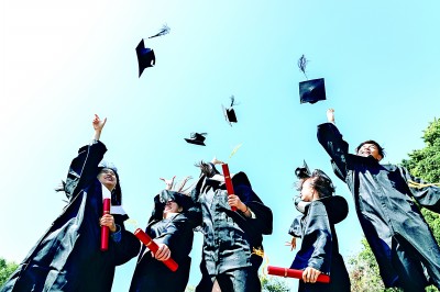 高校毕业生穿学位服拍照。光明图片/视觉中国