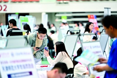 在“职引未来”——大中城市联合招聘高校毕业生天津师范大学专场双选会上,学生现场求职。新华社发