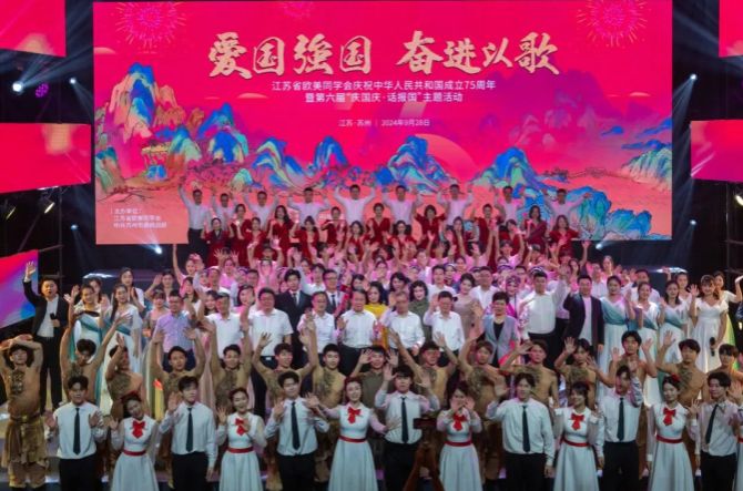 这是省欧美同学会第六次举办“庆国庆·话报国”主题活动。本次活动以“爱国强国,奋进以歌”为主题,来自全省各级欧美同学会组织的会员代表自编自创自导自演了《索我理想之中华》《传续:历史荣光耀千秋》《奋进:勇挑大梁走在前》《奋斗吧!中国!》四个篇章的精彩节目,呈现了江苏留学人员精神风貌和报国事迹,弘扬了留学报国光荣传统,表达了对伟大祖国的由衷热爱之情。省欧美同学会还举办了“我和我伟大的祖国”主题征文比赛颁奖仪式。