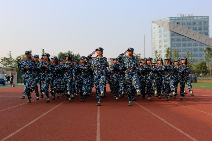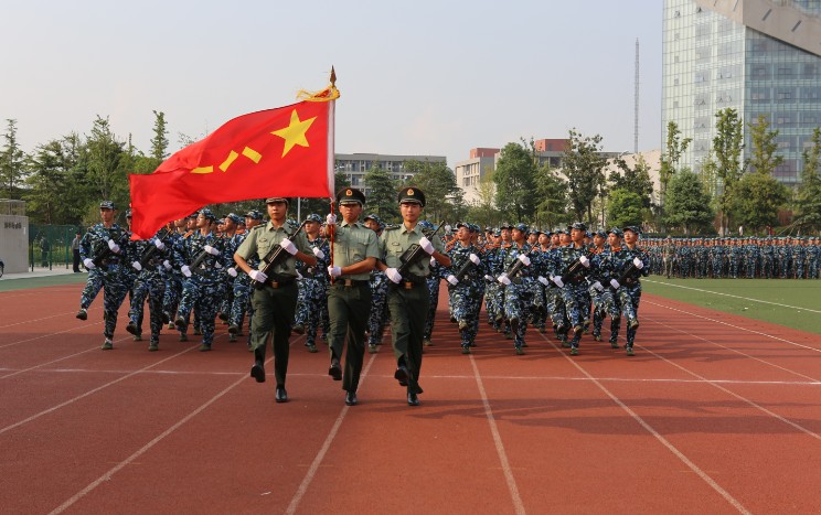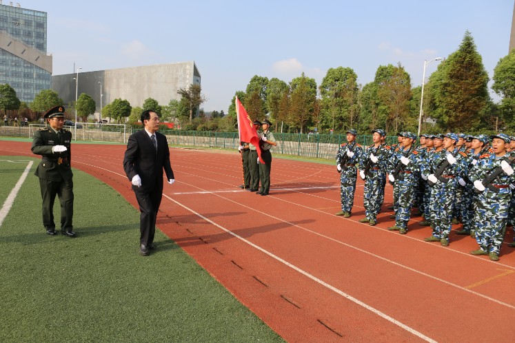 陈骏校长在军训旅旅长张念亮的陪同下检阅受训学生方阵。“为人民服务!”,响亮的口号展现了2013级新生积极饱满的精神状态。在分列式中,同学们被编排为15个方队,他们高喊着“诚朴雄伟、励学敦行、苦练本领、保家卫国”的口号,昂首挺胸,迈着整齐的步伐接受检阅。