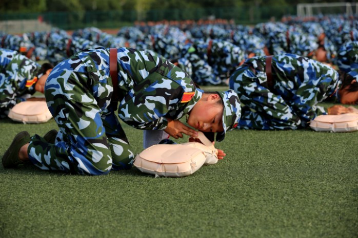 在军训表演中,由120名同学组成的急救方阵,以娴熟的手法展示了心肺复苏技能,这项训练是我校的特色培训项目。