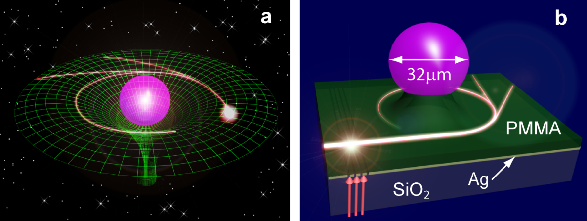 图一 光子芯片中引力透镜效应的模拟:(a) 天体周围引力场中光线弯曲;(b)光学微腔周围光线弯曲