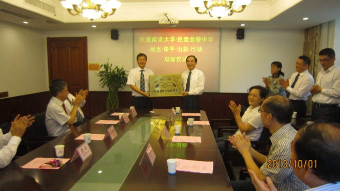 10月1日,秋高气爽,桂花飘香。正逢伟大祖国64周年华诞,民盟凯发k8官网委员会“烛光·牵手·出彩”行动走进凯发k8官网金陵中学,举行启动仪式,也为金陵中学125周年校庆献上了一份厚礼。正在参加金陵中学校庆活动的陈骏校长亲自为启动仪式授牌,并和与会人员合影留念。