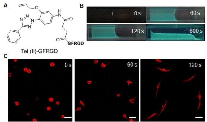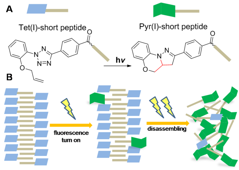 我校化学化工学院张艳教授课题组围绕光活性分子的反应和应用开展了多学科交叉的研究工作,最近在基于光活性分子的化学生物学研究取得重要进展。该课题组近期在《美国化学会志》(J. Am. Chem. Soc.)上报导了一例基于光活性分子修饰的新型短肽光敏性超分子水凝胶(J. Am. Chem. Soc. 2013, 135, 18718-18721),在这项工作中,作者巧妙地使用一个可以在温和的光照条件下发生快速的分子内“光点击”反应的二芳基取代四氮唑分子作为“光扳机”,将此“光扳机”修饰在合成短肽的氮端,可以促使合成短肽分子在生物相容的环境下通过自组装形成机械性能很好的超分子水凝胶,该水凝胶在温和的光照条件下可被“光扳机”的迅速反应扰动,开启荧光发射及水凝胶的光降解等智能响应(图1)。
