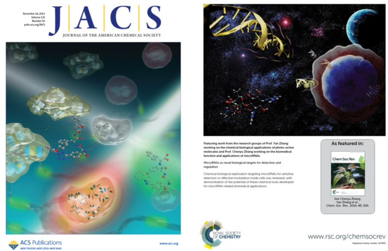 此外,该课题组还通过与我校生命科学院张辰宇教授研究团队的合作,积极探索由光活性分子的反应获取的新结构化合物在调控细胞内microRNA这一前沿研究方向上的应用。目前他们已经从基于光活性分子反应的新结构化合物中筛选得到了几类有重要调控活性的化学小分子。基于这些活性小分子构建探针开展的化学生物学研究也属于目前该领域研究的前沿,张艳教授和张辰宇教授就microRNA作为新型生物靶标的化学生物学研究撰写的综述也作为2014年第二期的封底(图3右)发表于颇具影响力的化学综述杂志 (Chem. Soc. Rev. 2014, 43, 506-517)。
