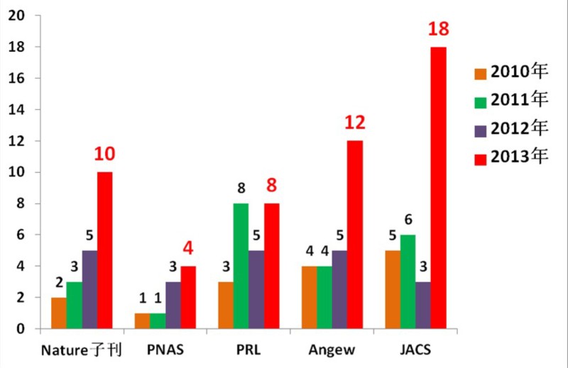 2013年,我校SCI论文发表取得优异成绩。截至2013年12月31日,我校在学科群一流期刊(Nature子刊、PNAS、PRL、JACS、Angew以及影响因子大于20的期刊)上共发表SCI论文55篇,是2012年发表数的2.4倍。其中,我校教师发表在Nature子刊上的论文篇数是2012年全年文章数的2倍;发表在JACS和Angrew两个期刊上的论文总数是2012年的3.75倍。