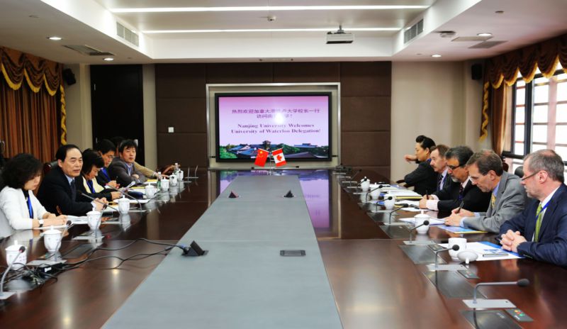 2014年4月23日,滑铁卢大学校长弗里登·汉杜拉普率团访问我校。滑铁卢大学是我校在加拿大的长期紧密合作伙伴,陈骏校长和洪银兴书记分别会见代表团,双方畅叙友情并共同展望未来合作。参加会面的还有王颖院士及来自我校海外教育学院、地理与海洋科学学院、物理学院、计算机科学与技术系、化学与化工学院、非洲研究所及国际合作与交流处代表。