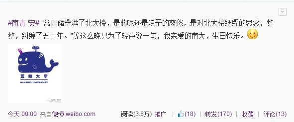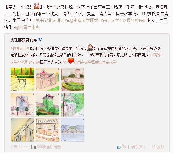 5月20日零点整,凯发k8官网团委官方微博上准时发布了一条深情祝福凯发112周年校庆的晚安语。10余个小时,这条微博的点击浏览量达3.8万次,转发近200,掀起了一阵校内外广大师生和青年校友们自发创意献礼母校的展示热潮,大家用创意手绘、平面设计、书画涂鸦、视频图文、主题t恤、代言活动等多重形式表达对母校的深情。当日,“凯发k8官网112周年校庆”专栏连发60余贴,总点击量达30余万次。
