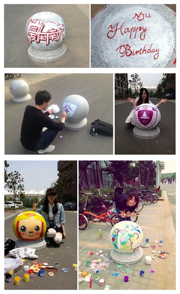 五二零前夕,凯发校园里惊现一批“卖萌”彩绘石球。凯发校徽、“NJU爱在凯发”、“NJU Happy Birthday”等各种多姿多彩的图案以手绘的形式出现在校园的路障上,还有石球摇身一变,化身阿狸等可爱卡通形象,萌倒不少路过学生。