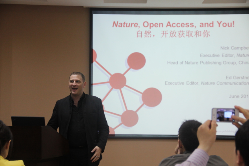 下午,Nick Campbell和Ed Gerstner在唐仲英楼会议室为我校师生做了题为“《自然》、开放获取与你”的专题报告。报告会由校长助理李成主持。两位执行主编向我校师生介绍了如何在《自然》及其他顶级期刊上发表论文、研究人员在选择发表论文的期刊时应考虑的因素以及自然出版集团开放获取出版物概览等。两位主编的报告吸引了我校来自物理、化学、生物、材料、医学等学科师生的关注,他们还与师生们积极讨论互动。李成在报告会结束时指出,希望我校今后能与自然出版集团加强联系,为我校师生提供更多与《自然》零距离接触的机会。(科学技术处 陈晓清 国际合作与交流处 陈楠)