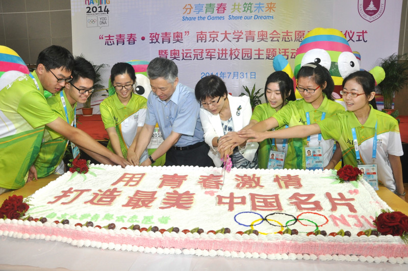 出征仪式上,领导、嘉宾、师生员工们一起分享了反映我校青奥志愿者在筹备期开展的学习、工作、培训和生活状况的温馨视频。青奥火炬手、外国语学院2013级本科生刘一戈同学对奥运冠军孙海涛、许安琪两位嘉宾进行了现场访谈,用奥运冠军的奋斗事迹为全场志愿者加油打气。青奥志愿者代表和相关保障部门的教师员工携手为全场带来了“八语版”诗歌祝福青奥圆满成功。活动尾声,全场齐唱生日歌,共同为在青奥会期间因服务工作错过生日的志愿者们送上集体祝福。
