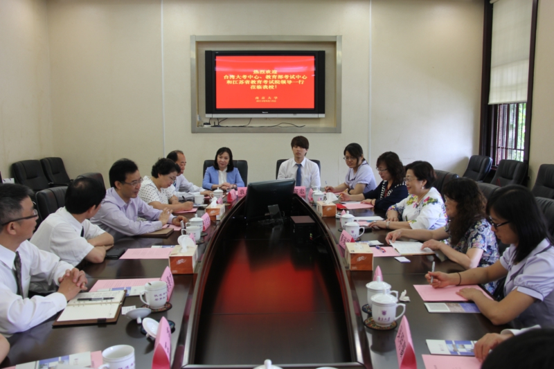 9月15日,教育部考试中心主任助理罗军以及台湾大学入学考试中心副主任洪冬桂一行10人,在江苏省教育考试院党委副书记、纪委书记李晓婷等的陪同下,来到我校参观访问并交流座谈。我校党委常委、副校长谈哲敏,学工处、考试中心以及本科招办等部门负责人参加座谈会。