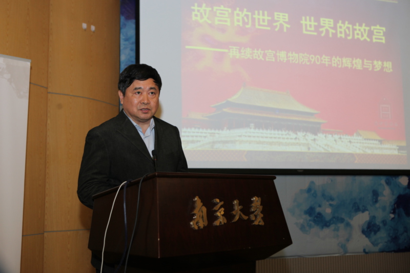 颁奖仪式结束后,在师生热烈的掌声中,单霁翔院长为师生做“故宫的世界,世界的故宫”主题演讲。演讲中,单霁翔院长介绍了故宫博物院的职能与功能,指出故宫从向社会开放的第一天起就是引人瞩目的文化教育机构,在现今社会更肩负厚重的社会责任,专业化与社会化功能集于一身,既是博物馆,又是旅游目的地,同时也是世界文化遗产。单霁翔院长盘点了故宫博物院最主要的三项文化资源:大规模的古建筑群、丰富的文物藏品和庞大的观众群。单霁翔院长指出,紫禁城建筑群呈现出的清晰的轴线、开放的格局,深刻地影响了北京的城市面貌。这些壮美的古代建筑形制严谨,彩绘绚丽,空间生动,装饰精美,独特的色彩中保留了真实的历史信息,典雅的园林与美丽的天际线共同构成和谐的景观,是中国官式古建筑的最高形式。据单霁翔院长介绍,故宫博物院收藏的180多万件文物呈“倒金字塔”分布,即珍贵文物占文物总数的绝大部分,与国内外大多数博物馆情况相反。目前,故宫是世界上唯一一座每年观众接待量在一千万人次以上的博物馆,且这一数字仍在不断攀升。巨大的人流增加了安全隐患的同时也降低了观众参观的质量。随后,单霁翔院长向师生们介绍了故宫博物院未来工作的几大方向:首先,是正在进行中的古建筑的保护与修缮工作。故宫争取在2020年紫禁城建成600年之际,完成对故宫古建筑的整体保护修缮工作。故宫正在按照计划拆除园内影响古建筑景观并存在安全隐患的临时建筑,叫停了利用古建筑或与古建筑环境氛围不协调的商业化活动。其次,是实施“平安故宫”工程。通过进一步加强故宫安全防范新系统、改造底下文物库房和基础设施、开展院藏文物抢救性科技修复保护,建设文物科技保护实验室等措施,同时建设博物院北院区,来解决火灾、盗窃、震灾、藏品自然损坏、文物库房保管、基础设施陈旧、观众安全这七大方面的隐患。第三,为了更好地实现故宫博物院的各项功能,故宫目前正积极扩大开放区域,丰富展览内容,开辟新展览地点,并利用高科技手段,用虚拟现实技术为观众带来更好的参观体验。为了更好地服务观众、提升参观体验、宣传故宫文化,单院长向师生介绍了故宫博物院在改进购票方式、改善休息环境、完善无障碍设施、开发故宫文化创意产品等方面的努力。单霁翔院长以自己在历史学、建筑学、博物馆学等方面的深厚功底和多年文保工作的丰富经历,用平实而风趣的语言,赢得了师生们的满堂喝彩。