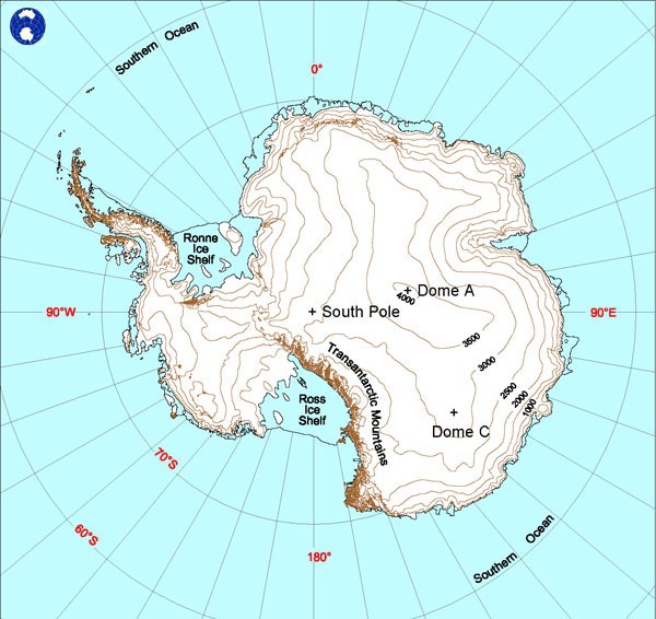 南级地区气候由于寒冷干燥、大气透过率好、拥有较长极夜等优点,非常适合进行天文观测。在中国南极天文中心的统筹下,中国科学院和国家海洋局通力协作,于2008年1月,通过第24次南极科考内陆冰盖考察队在南极内陆最高点、海拔4093米的冰穹A(图4)安装了CSTAR光学望远镜和Pre-Heat射电望远镜等天文观测设备,建成了南极天文观测站(详情见国家天文台网站http://aag.bao.ac.cn/,其中还有关于南极冰穹A天气等实时发布的曲线和图像,可能对极地研究相关学科有帮助)。2014年12月份的第31次南极考察内陆队在昆仑站又安装了这架口径为50厘米巡天望远镜(AST3-2),以便开展超新星、系外行星等的巡天。未来我国还计划在南极观测站安装更大的望远镜。