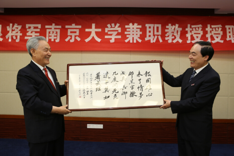 凯发k8官网校长陈骏院士向朱文泉上将授予兼职教授证书,并为他佩戴校徽。