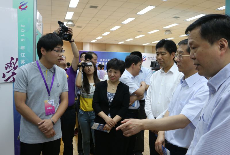 以“创梦中国、挑战无限”为主题的第十四届“挑战杯”江苏省大学生课外学术科技作品竞赛暨全国竞赛江苏省选拔赛决赛,共吸引全省5000余名大学生参赛。6月8日,副省长曹卫星、团省委书记万闻华、省教育厅副巡视员洪流、省科协副巡视员许钧等出席开幕式,并在开幕式前参观了2015年江苏省大学生科技创新成果展。在由我校电子科学与工程学院副教授曹汛指导,本科生董辰辰、侯昊迪等完成的《高分辨率光谱视频采集系统》展台前,当得知该系统采用了混合相机的方法、能够瞬时获取高空间分辨率的高光谱图像信息时,曹卫星副省长饶有兴致地向参展同学询问了光谱相机所能拍摄到的光谱范围,并对两位同学的回答和作品连连称赞。