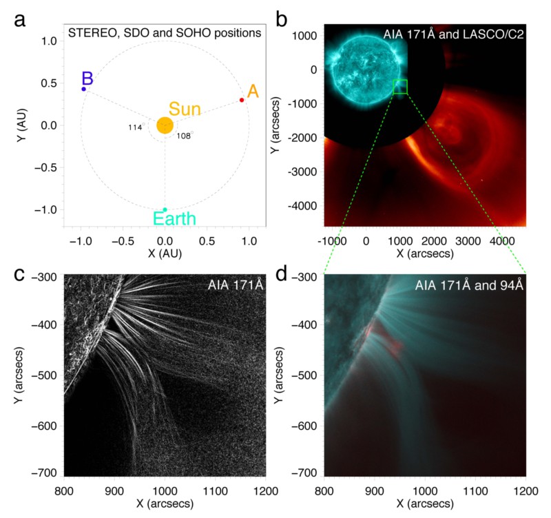 图1 (a) 观测卫星的空间位置;(b) 太阳爆发及磁重联位置;(c) 观测的磁重联图像;(d) 171埃(蓝色,低温)和94埃(红色,高温)辐射图像