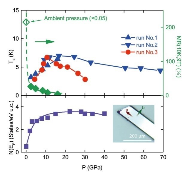 图:(上) WTe2压力-超导温度相图(下)理论预测态密度随压力变化及晶体照片