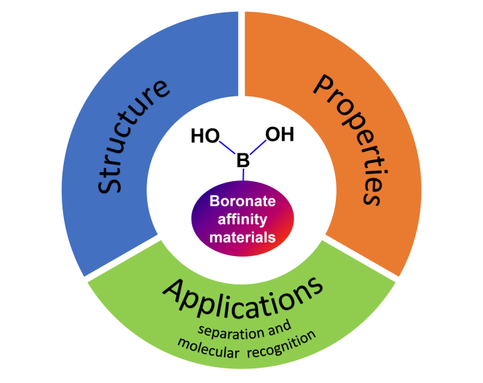 硼亲和材料,尤其是用于分离和分子识别的硼亲和材料,在近十取得了显著进步,在性能上多次突破原有水平,在应用上扩展到多个重要领域。刘震研究团队在硼亲和材料的制备和应用方面做出了重要贡献,已在化学领域顶级期刊德国《应用化学》(Angew. Chem. Int. Ed., 2009, 48, 6704-6707; 2013, 52, 7451-7454; 2014, 53, 10386-10389; 2015, 54, 6173–6176; 2015, 54, 10211-10215 (VIP))和英国《化学科学》(Chem. Sci., 2012, 3, 1467-1471; 2013, 4, 4298 – 4303; 2014, 5, 1135-1140; 2014, 5, 4065-4069)上多次发表高水平研究论文,已申请发明专利14项(已获授权7项)。这些研究成果产生了重要影响,得到学术界及工业界的好评与关注;Chemistry World和LCGC 等杂志专题介绍了相关工作,多家公司对相关材料表现出极大的兴趣,获John Wiley、Royal Society of Chemistry和Springer等出版社的邀请撰写专著和专章(已完成4章专章)。然而,文献中尚没有全面总结该领域的最新进展的权威性综述。为此,该论文批判性地评述了该领域的最新发展,着重介绍了近10年中的理论进展和新颖硼亲和材料,特别地讨论了配基和支撑材料的结构对材料性质的影响,介绍了这些硼亲和材料在亲和分离、蛋白质组学、代谢组学、疾病诊断和适配体筛选等多个领域中的应用。