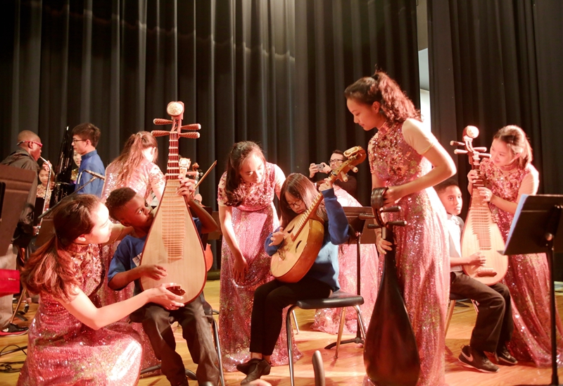 路易斯安那泽维尔大学孔子学院学生上台体验民族器乐