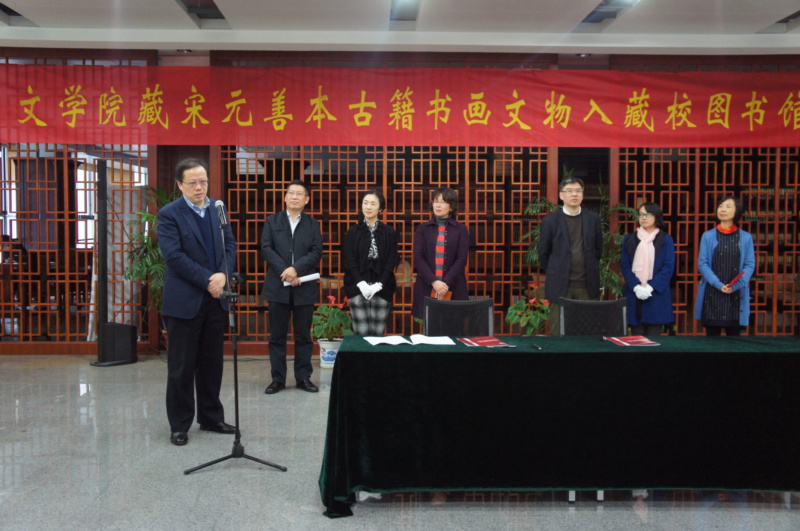 文学院徐兴无院长与图书馆史梅副馆长签署入藏协议,文学院图书馆馆长黄静与校图书馆古籍部主任李丹进行了藏品交接。