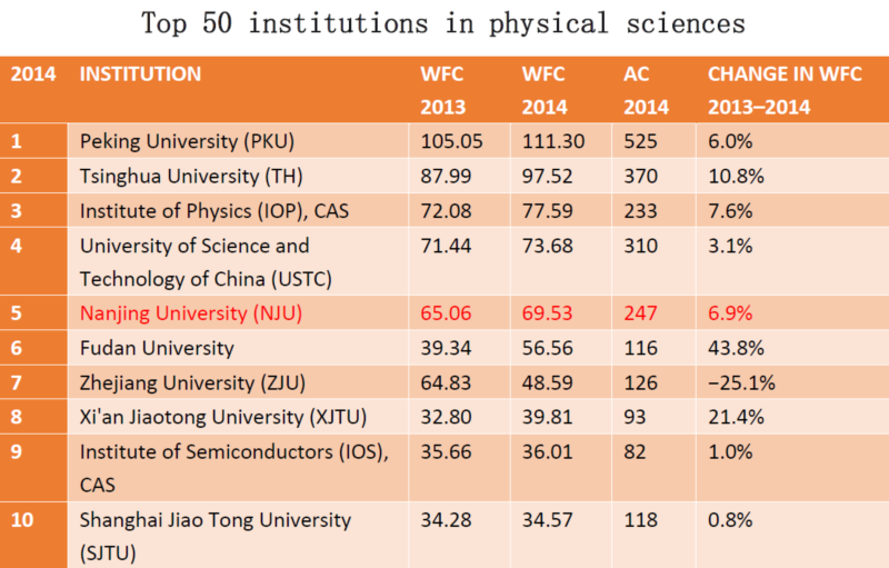物理科学领域,2014年度凯发k8官网位列全国研究机构和高校第5位,全国高校第4位,WFC指数为69.53,较2013年增长6.9%。