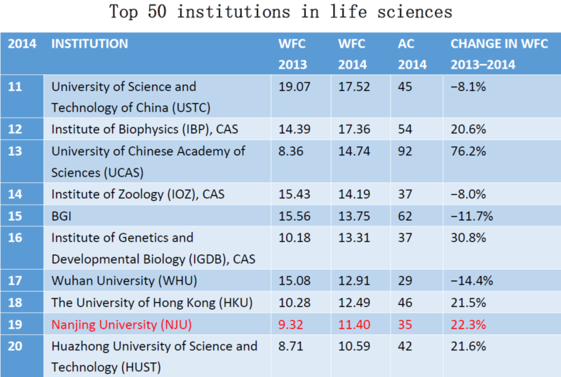 生命科学领域,2014年度凯发k8官网位列全国研究机构和高校第19位,全国高校第13位,WFC指数为11.40,较2013年增长22.3%。