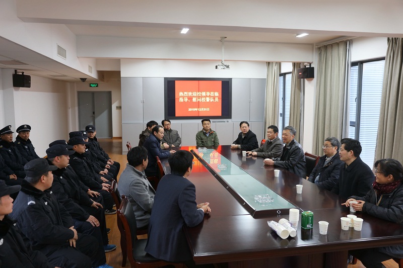 在保卫处,张异宾一行来到应急指挥中心,向校警队员致以节日的慰问,并与大家合影留念。张异宾询问了校园监控设备的维修更新情况和校园安全情况,了解到我校低案发率高破案率的治安现状,他说,校园安全工作非常重要,要舍得投入经费,及时采用新的科技设备,确保校园安全。校警队员面对危险、面对艰苦,是聚光灯背后的工作。张书记表示,感谢校警队员为校园安全所做的努力,学校将继续改善校警队员的生活条件。