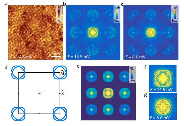 图2.(a),在能量为14.5mV测量到的微分电导(dI/dV, 对应电子态密度)在空间的分布。可以看见一些电子波干涉的图案。(b),图(a)中的电子干涉图谱经过傅立叶变换以后的图案。(c),同样方法在小能隙能量附近8.6mV测量到的QPI图案。(d),理论预测的大概费米面图形。(e),根据(d)中的费米面信息所做的模拟QPI图案,与实验结果(b,c)相似。(f),(g),小动量散射的QPI图案,反映的是费米面内部散射的信息。