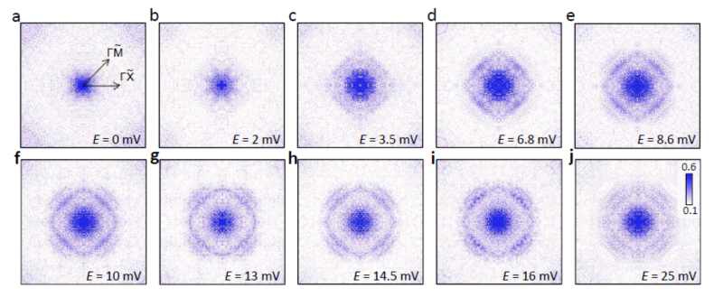 图3. (a)-(j) 根据相应能量测量到的态密度空间图谱, 通过傅立叶变换以后获得的倒易空间电子结构的信息。在小能量的时候,内套费米面先显露出来;在大能量的时候,外套费米面开始显露。因此可以推论,存在由于费米面套叠或杂化形成的内外套费米面,而大(小)能隙对应外(内)套费米面。