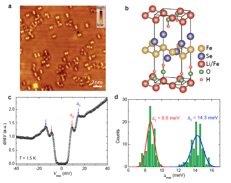 图1. (a), (Li1-xFex)OHFeSe超导体解理后露出的硒原子面(周期性亮点)和杂质点(哑铃状亮点)。(b), (Li1-xFex)OHFeSe原子结构示意图。 (c), 远离杂质点测量到的典型隧道谱形状,可以清晰看见两个能隙结构。(d), 在一个解理面上测量的98条谱上能隙的统计结果。